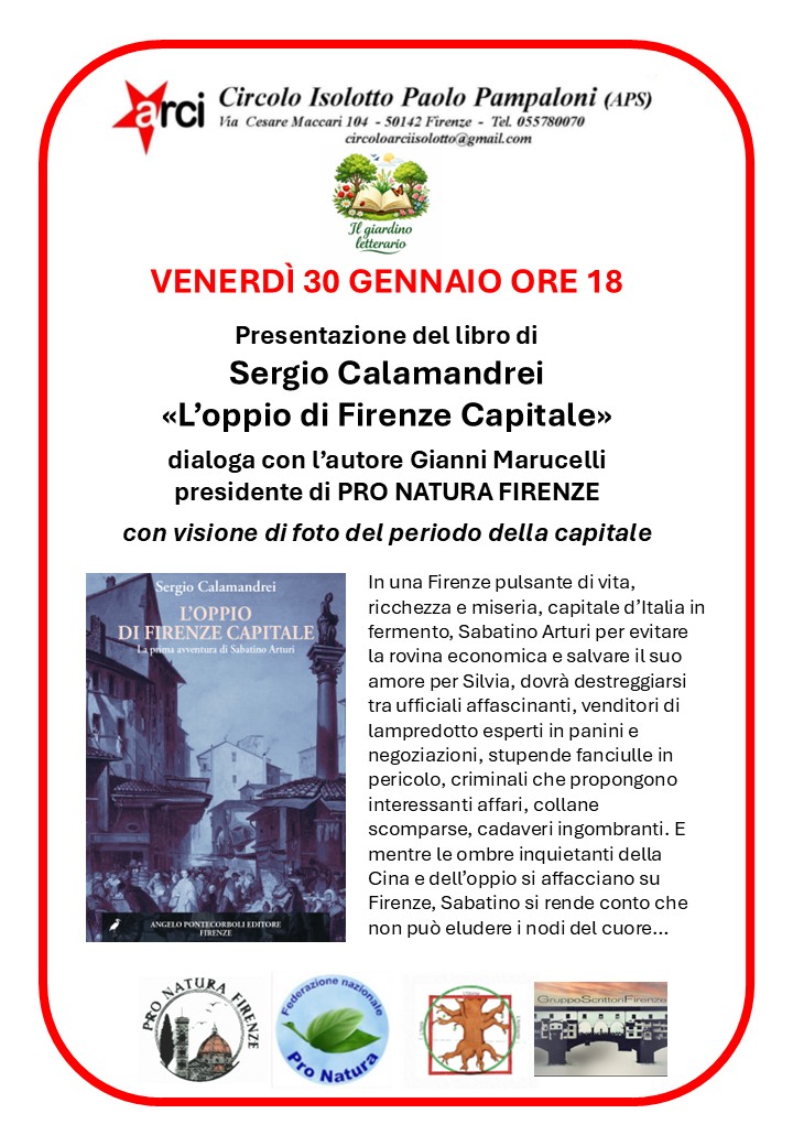 Venerdì 30 gennaio alle 18 insieme a Gianni Marucelli parleremo del mio L’oppio di Firenze Capitale presso il circolo Isolotto “Paolo Pampaloni APS”, Via C. Maccari 104, Firenze.